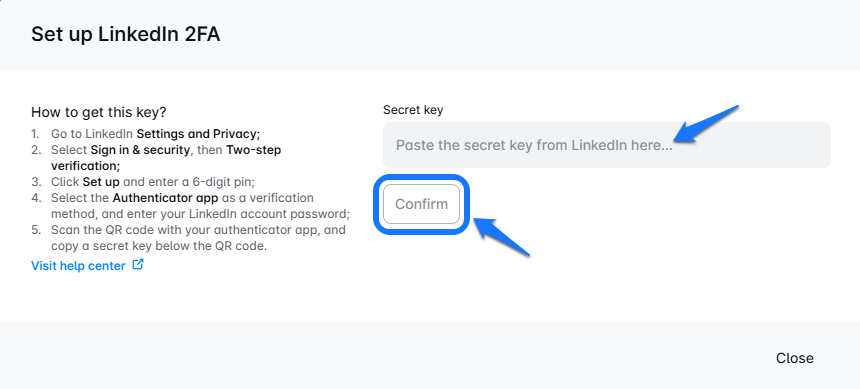 Back in Leadslinkin, paste that secret key into the field provided and hit Confirm.