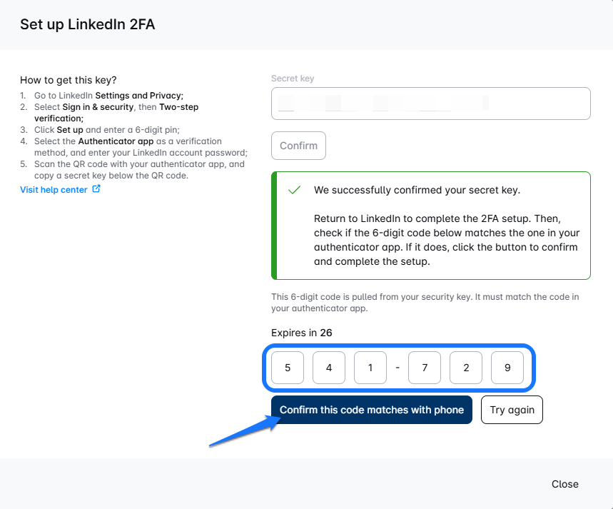 Now go back to LinkedIn and complete the process. You’ll see a code in your authenticator app — make sure it matches the one displayed in Leadslinkin. If it does, just click Confirm this code matches with phone on LinkedIn. ✅