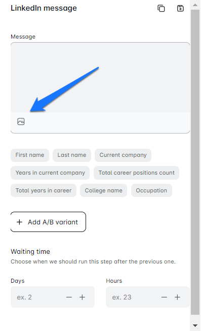 - For email messages, choose where to insert your image or GIF. For LinkedIn messages and InMails, Leadslinkin will place your personalized images and GIFs at the bottom of the message.