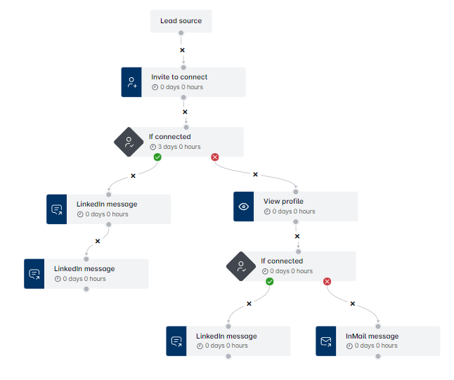 - After sending the invite to connect, there’s a condition ‘If Connected’ that checks if the lead has accepted your connection request within a set time frame (e.g., 2 days).
