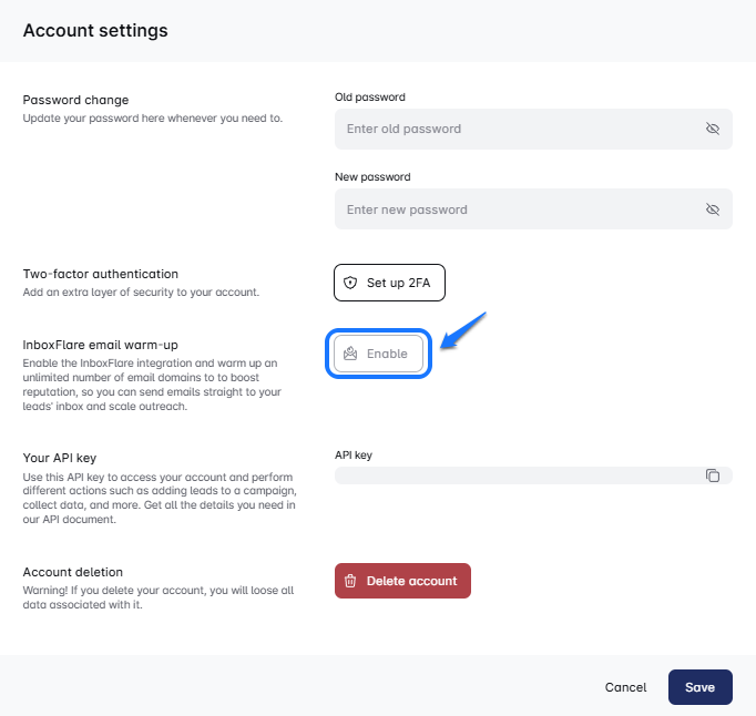1. To start, you need to enable your InboxFlare account in Leadslinkin. Go to your Account settings in Leadslinkin and find the InboxFlare email warm-up. Click “Enable”.