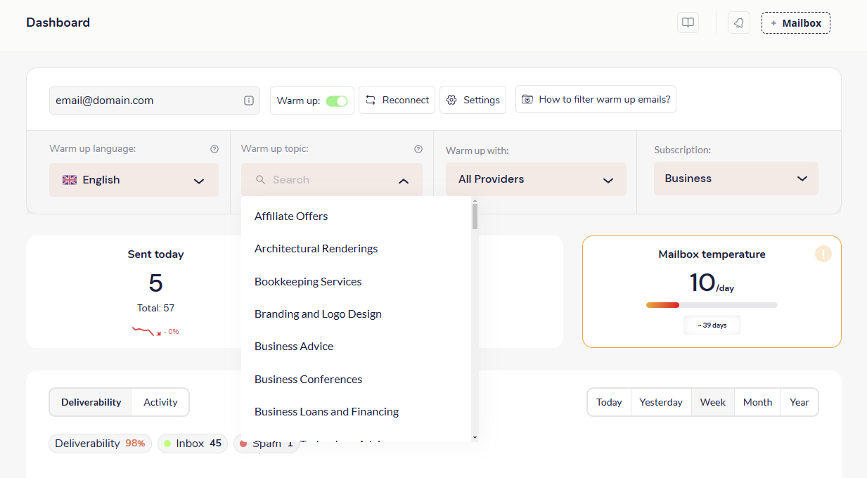 3. Choose specific topics for emails - This is where Warm up topic comes in. You can choose a topic for your account, and it will generate warm-up emails for specific industries, helping you personalize your warm-up further.