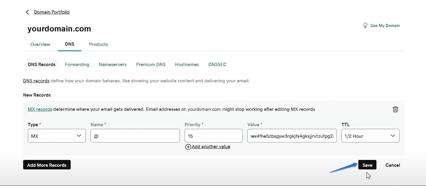 🔔 Here’s how adding your MX record should look like in GoDaddy.